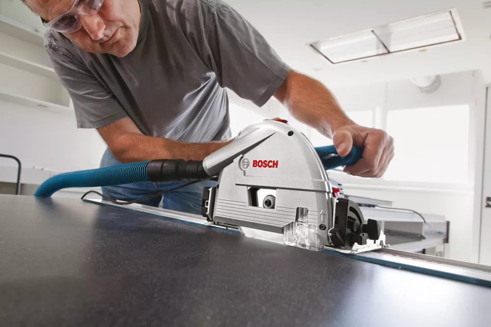 Adjustable speed, powerful motor and constant electronics for cutting different materials such as wood, panel materials, aluminium and acrylic glass. Allows for fine adjustment of both the cutting angle and depth, making it ideal for precision work. Dust extractor makes it suitable for inside work. A steel and aluminium base and guard mean the tool is durable yet lightweight and replaceable carbon brushes make it easy to maintain. The 1400W motor features soft-start technology, which prevents voltage spikes during start-up and as a result increases the life of the tool.