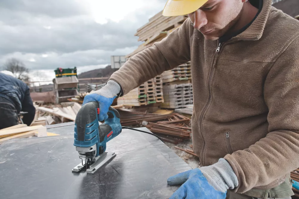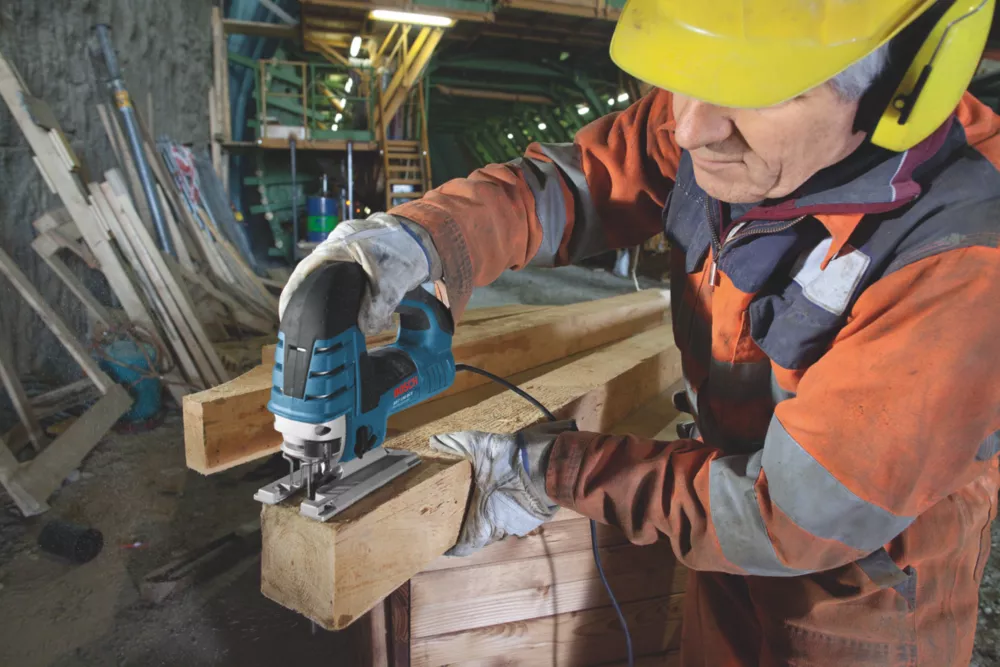 Robust and powerful jigsaw with large cutting depth and SDS blade change. Supplied with T144D saw blade and carry case.