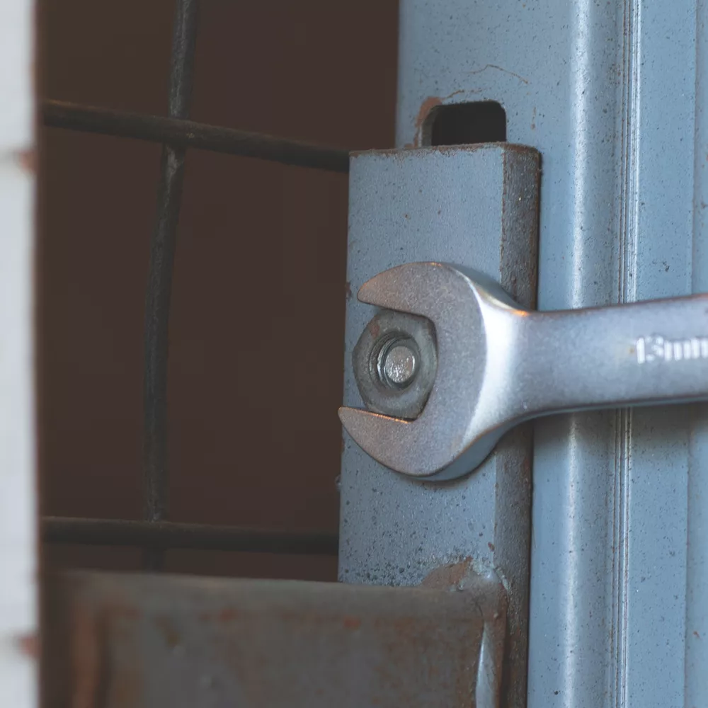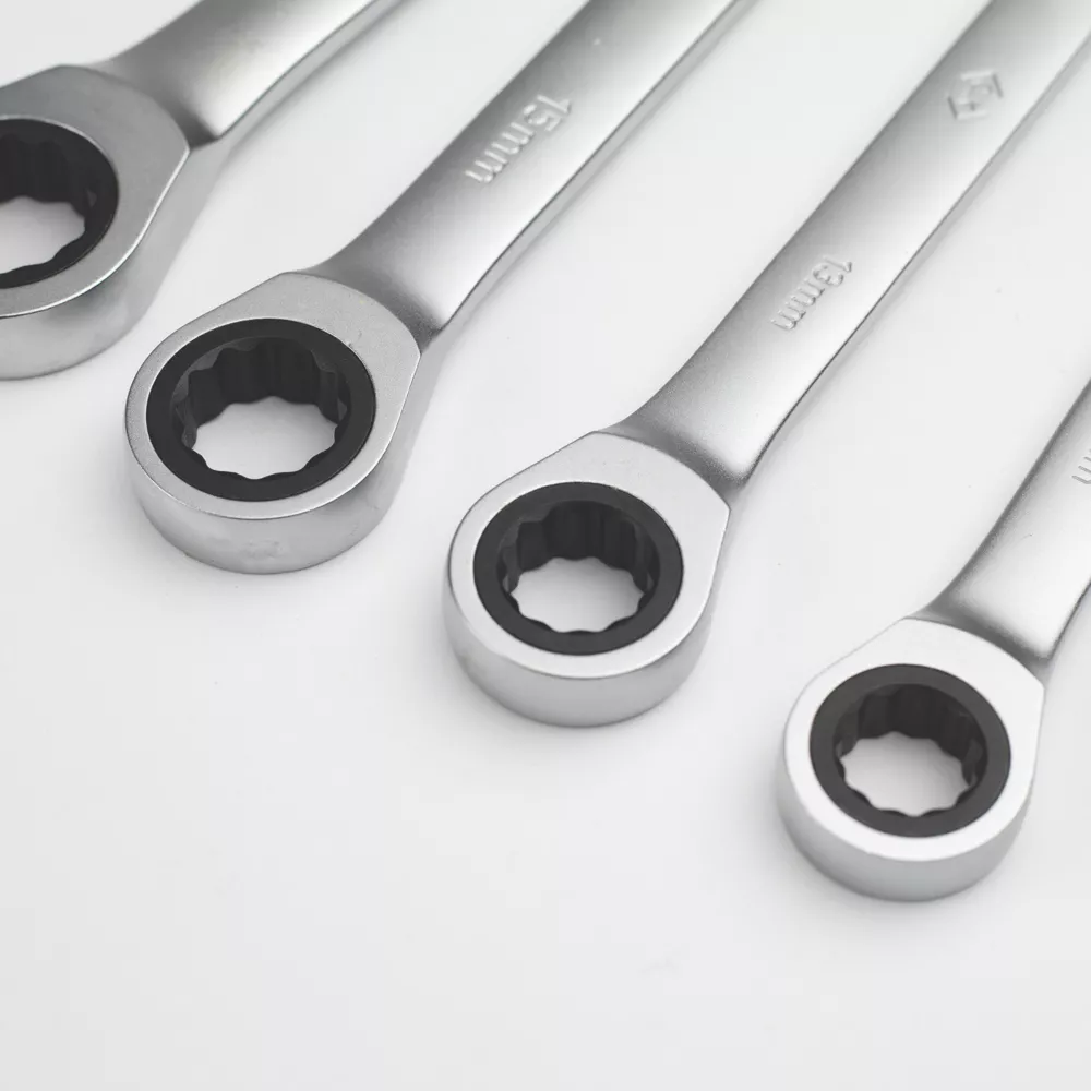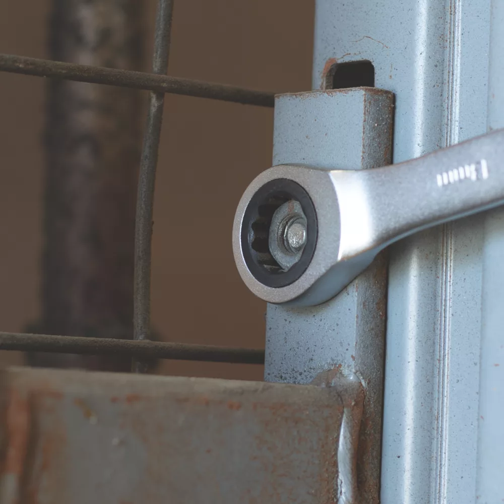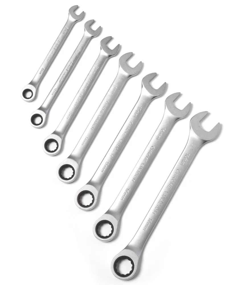 Chrome vanadium steel construction. Hardened and tempered for strength and durability. Supplied in a wall-mounting rack for convenient storage.