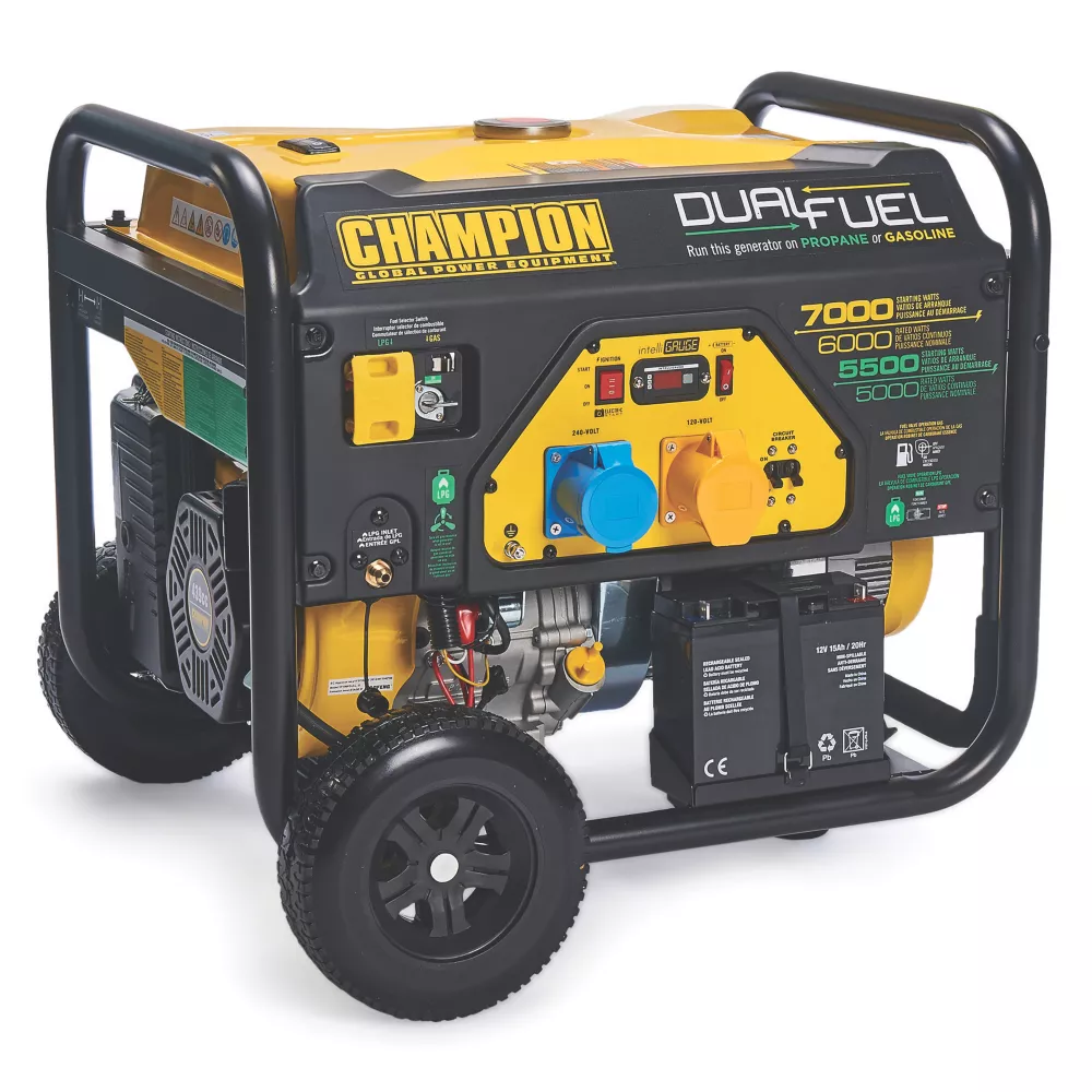 Dual-fuel generator for use with petrol or LPG. Powered by a Euro 5 439cc Champion single cylinder, 4-stroke OHV engine. Includes 2 outlets: 120V 32A and 240V 32A. Produces 6000 running watts and 7000 max watts on petrol, and 5500 max watts and 5000 running watts on LPG. Reliable power with up to 8hrs using petrol or up to 19hrs with LPG at 50% load.