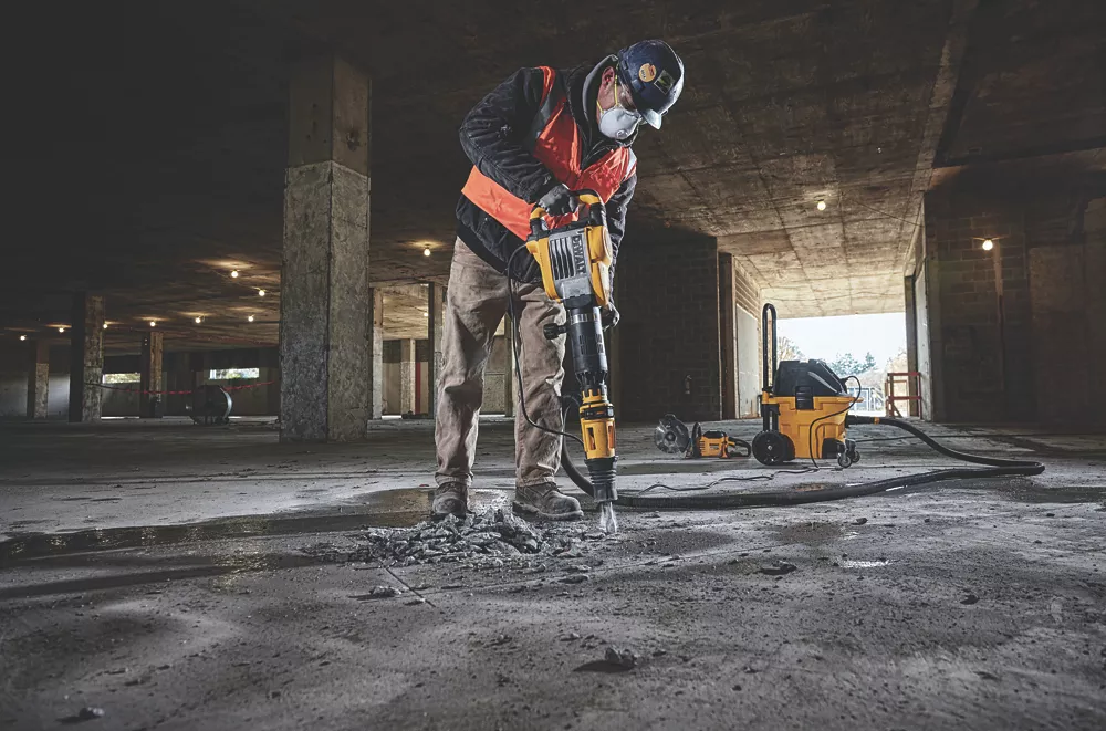 Wet and dry pick-up with variable suction control. Ideal for even the finest concrete and wood dust. Features an auto-dual filter cleaning system which reduces clogging and delivers constant suction power during tough construction applications. Built-in power take-off socket for auto-start and stop. Audible alarm to alert a drop in performance. Telescoping handle and large rear wheels allow easy transportation.