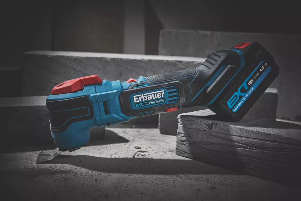 Compact and lightweight Erbauer multi-tool suitable for use with metal or wood applications. Includes 4.0Ah battery and charger. Tool-free accessory change with universal fit. Advanced brushless motor technology for more power and higher torque. Keep Cool battery technology actively manages temperature, so cells do not overheat, giving more power, longer run time and battery life. Part of the Erbauer EXT and EXT EliteCell, one battery system, running multiple tools for increased flexibility. Compatible with all Erbauer 18V EXT and EXT EliteCell batteries and chargers. Supplied with charger and carry case.