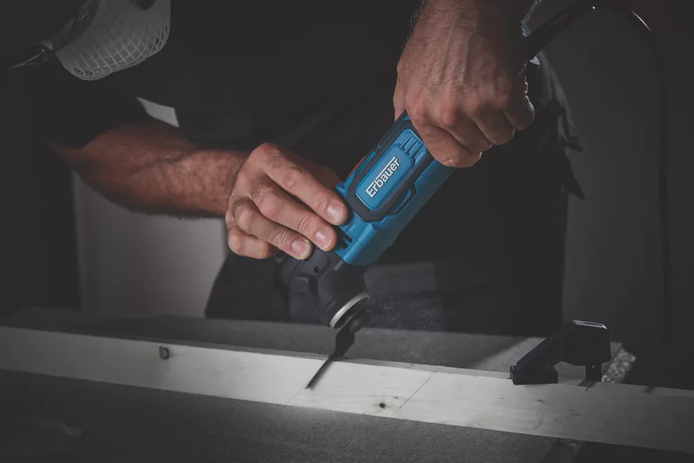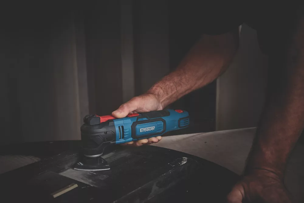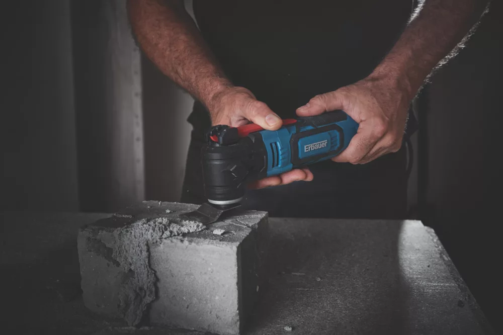 Powerful multi-tool with 3.2° oscillation angle and variable speed control for sawing, sanding and cutting. Suitable for metal or wood applications. Features include overcurrent protection and dust seal protection. Supplied with 44 accessories and a hard carry case.