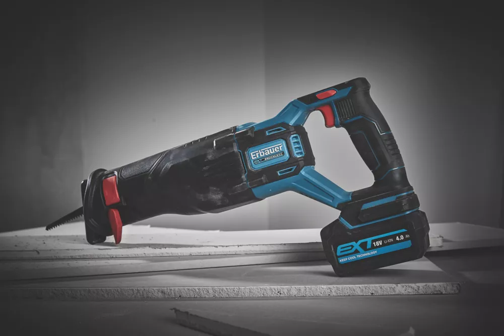 Reciprocating saw suitable for metal and wood applications. Heavy-duty metal gear housing and aluminium gear box. Features variable shoe position, quick tool-free blade change and advanced brushless motor technology. LED light illuminates work area for precise sawing. Keep Cool battery technology actively manages temperature, so cells do not overheat, giving more power, longer run time and battery life. Part of the Erbauer EXT and EXT EliteCell, one battery system, running multiple tools for increased flexibility. Compatible with all Erbauer 18V EXT and EXT EliteCell batteries and chargers. Supplied with 2 x blades and charger.