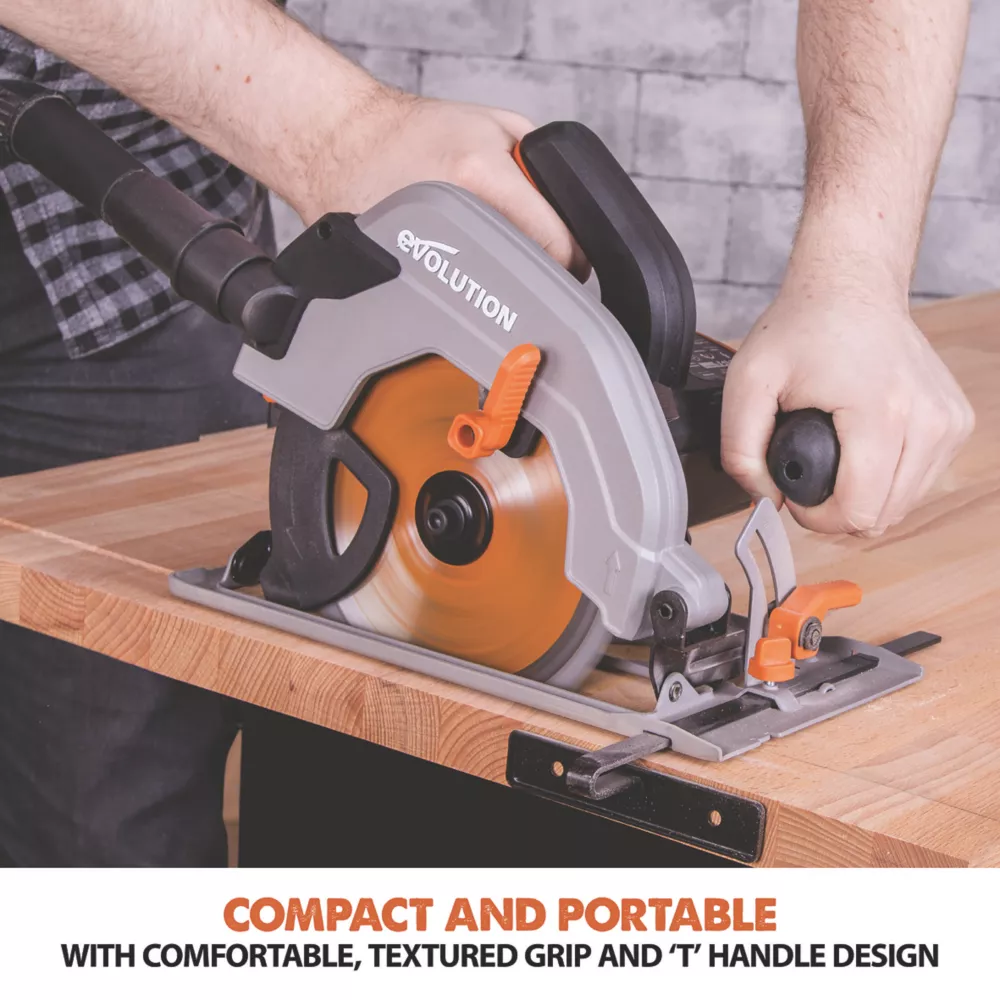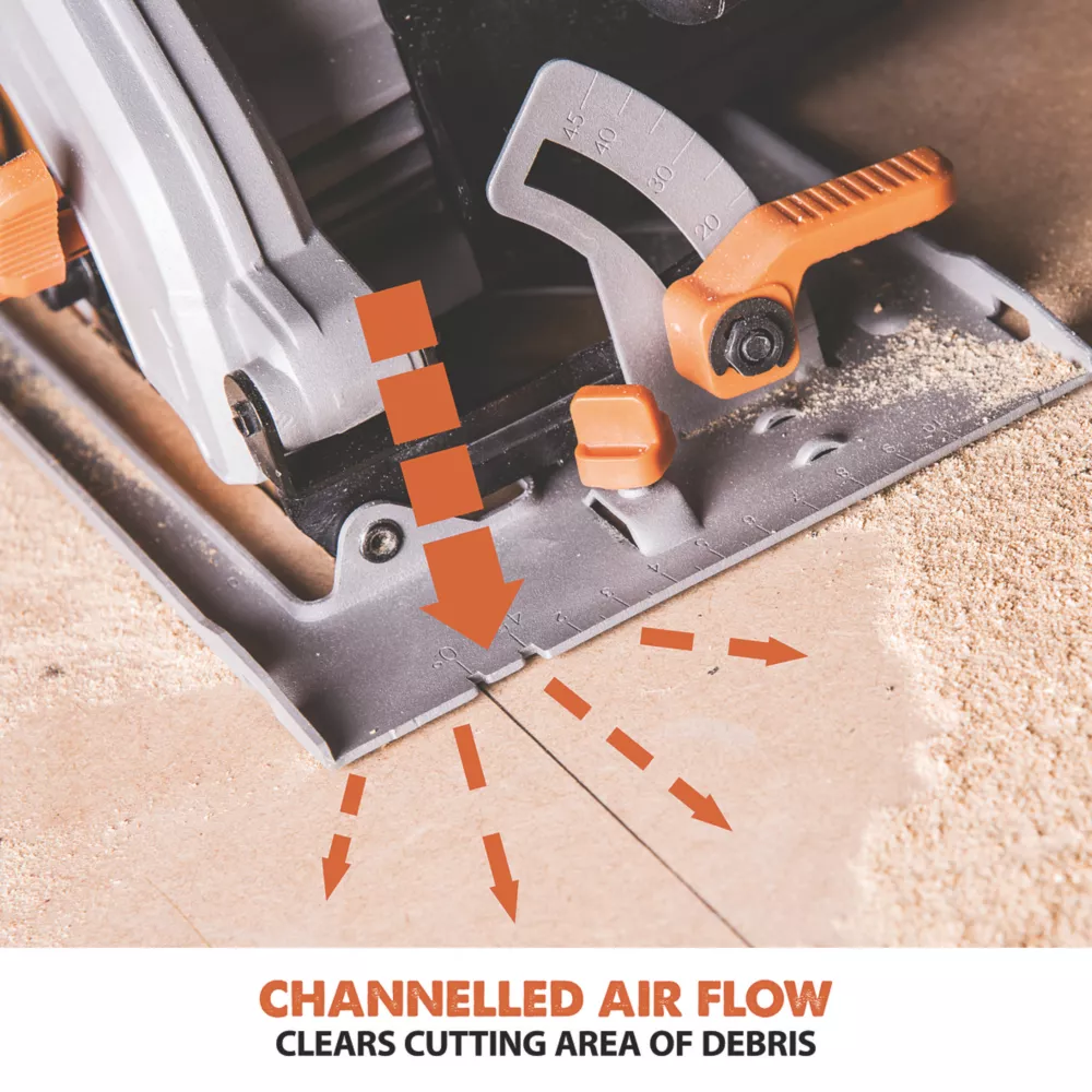 High-powered and optimised using multi-material technology to cut mild steel, non-ferrous metals, wood, wood with embedded nails and plastic with a single blade. Balanced, lightweight and compact, delivering a maximum cutting depth of 53mm. Integrated dust blower allows optimum visibility along cutting line. Quick-adjust bevel lever and clear, debossed angle markings improves ease and accuracy of bevel cuts. Safety features include a lock-off switch, electronic blade brake and spindle lock for easy blade changes. Over-moulded handle improves ergonomics and comfort. Includes housing on-board tool storage for blade change hex key. Supplied with 165mm TCT blade, hex key and parallel guide.
