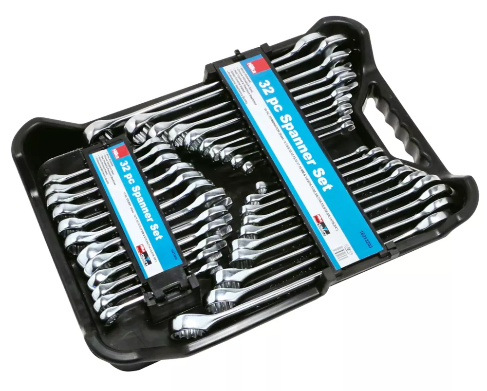 Fully polished, chrome vanadium steel spanners. Heat-treated and precision-machined. All with 12-point pro-drive ring ends. Supplied in plastic case.