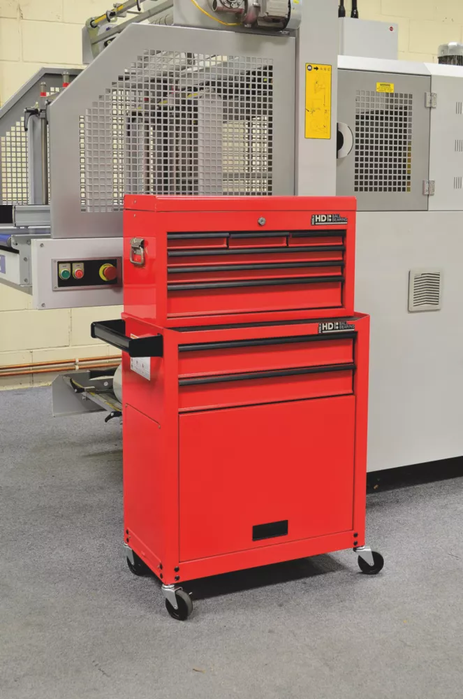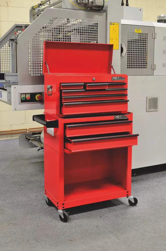 Mechanic’s tool chest and cabinet combination, with super-smooth ball bearing slides. Features swivel castor wheels for improved mobility.