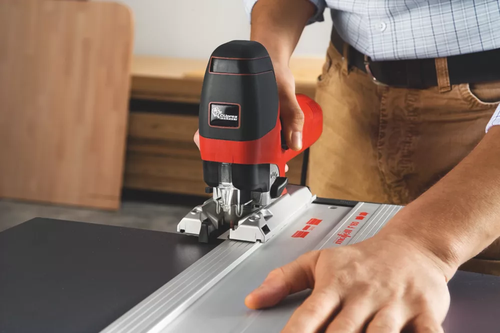 900W precision jigsaw with 114mm depth of cut and continuously variable cutting speed to suit any material. Sturdy base plate with integrated vacuum channel and quick-release mechanism. Ergonomic design features low centre of pressure and soft pads for comfort in use. Sophisticated self-extraction and integrated blower keeps the work surface free from chips, even without a dust extractor. Wedge-shaped blade ensures precise square cuts, even when cutting curves. Simple single lever blade change with innovative clamping system. Features CUnex W1 saw blade for extremely precise sawing. Use with guide rail for precise straight cutting. Supplied with parallel fence and circle cutting attachment.