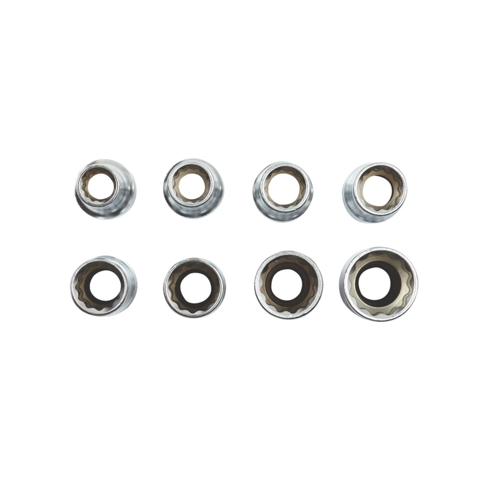 Precision-ground hardened tool-grade chrome vanadium steel for extra strength and durability. Sockets feature cross-knurling for improved grip and 12 contact points. Supplied on a rail for easy storage