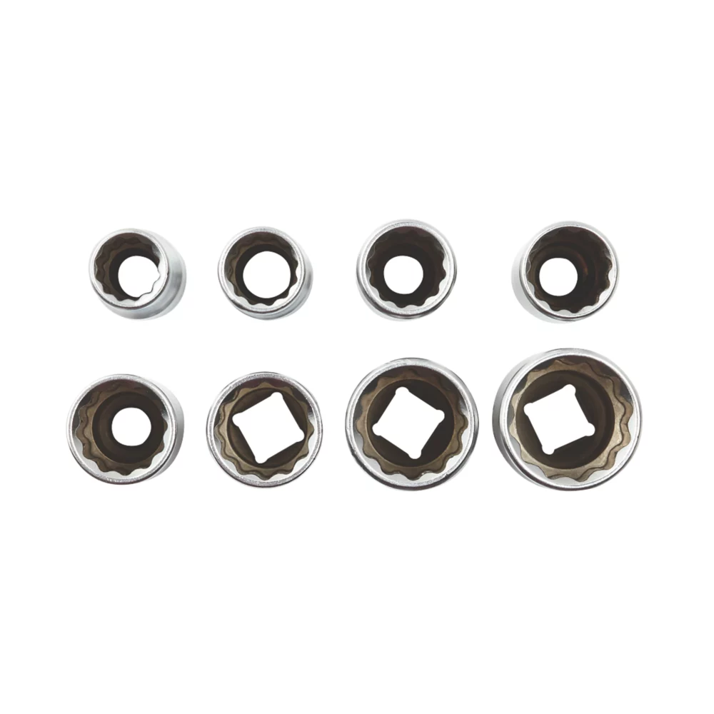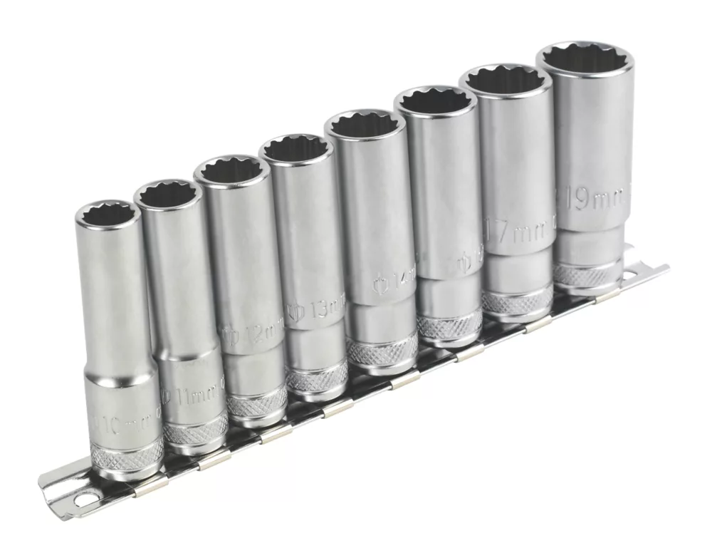 8 piece Magnusson 3/8″ deep socket rail suitable for automotive and general home use. Precision-ground hardened tool-grade chrome vanadium steel for extra strength and durability. Chamfered lead-in sockets for easy placement onto drive tools and fasteners. Large hard-stamped size markings allow for easy identification of socket size. Wipe clean easily of oil and dirt.