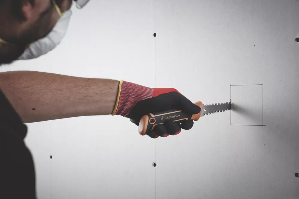 Heat-treated steel blade with ergonomic soft-grip handle for comfort and control. Double-sided blade for easy manoeuvring when cutting plasterboard. Cuts on push and pull.