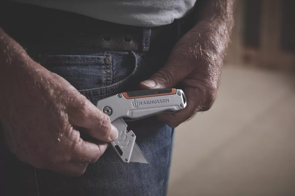 Folding blade for safety and storage with ergonomic cutting angle. Wire-stripping notch for removing insulation safely. Supplied with 5 blades and a storage pouch.
