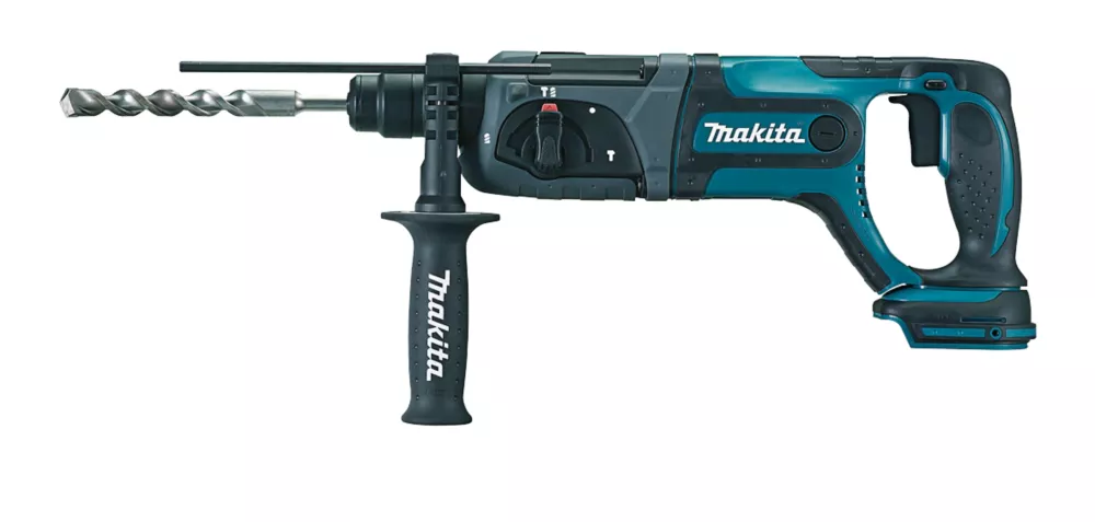Cordless, 3-function SDS Plus multi-use drill with rotary hammer, rotary only and hammer only modes. When used in hammer position the chisel can be locked in any of the 40 pre-set angles. Features torque limiter and depth stop to prevent overload and over-drilling. Rubber bumper and joint construction protects function lever, gear housing and battery terminals. Anti-slip rubberised side grip for user comfort.