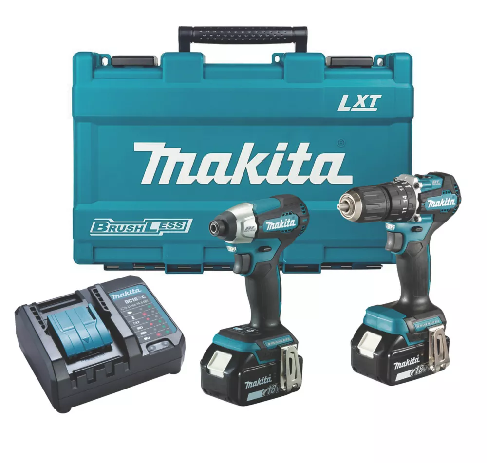 Brushless twin pack containing combi drill and impact driver. Lightweight and compact combi drill has a 2-speed gearbox with all-metal gears for extra durability. Impact driver features assist mode, which slowly increases the power delivery as the unit comes under load, making it easier and more efficient to drive fixings. Both machines are equipped with LED work lights, variable speed controls and electronic brakes.