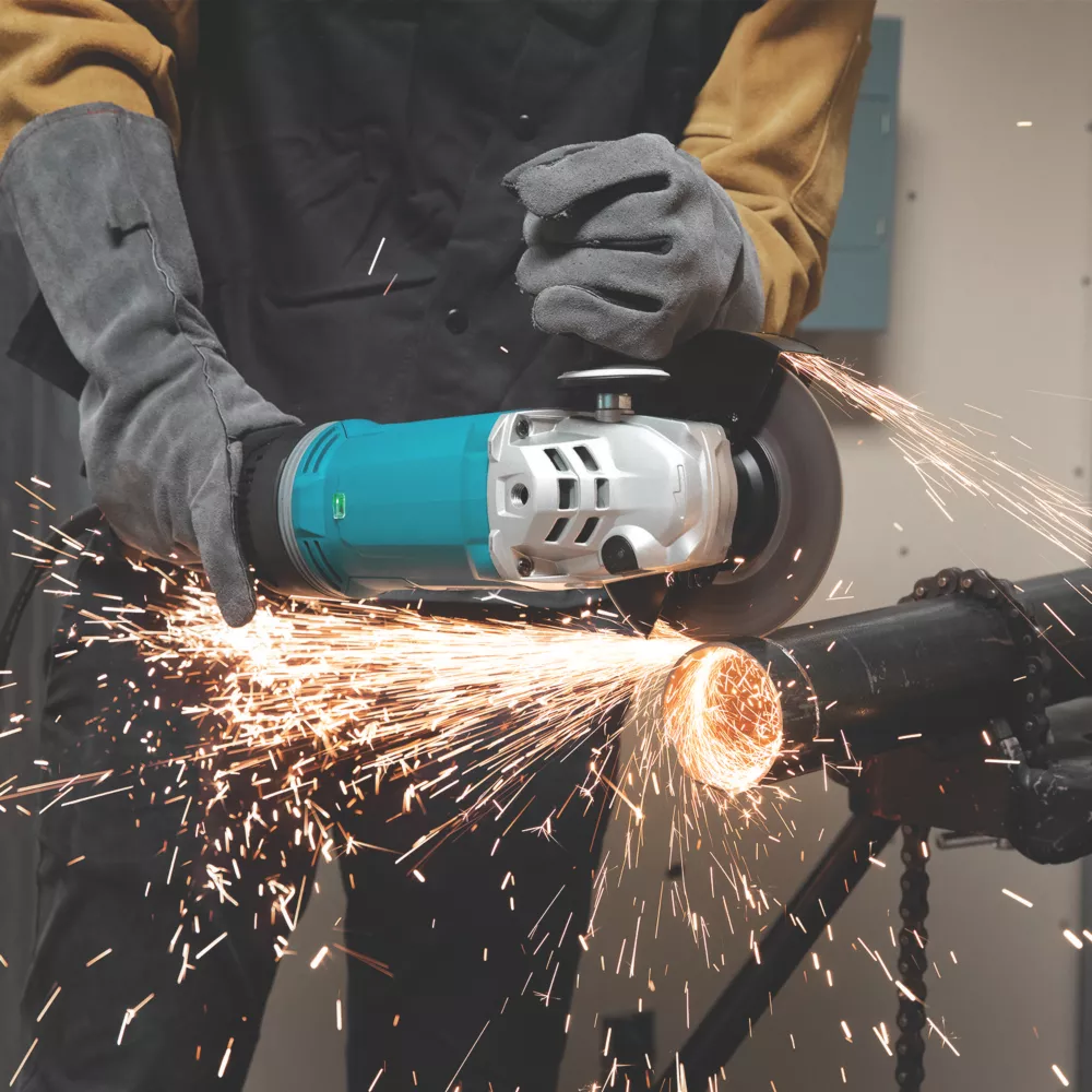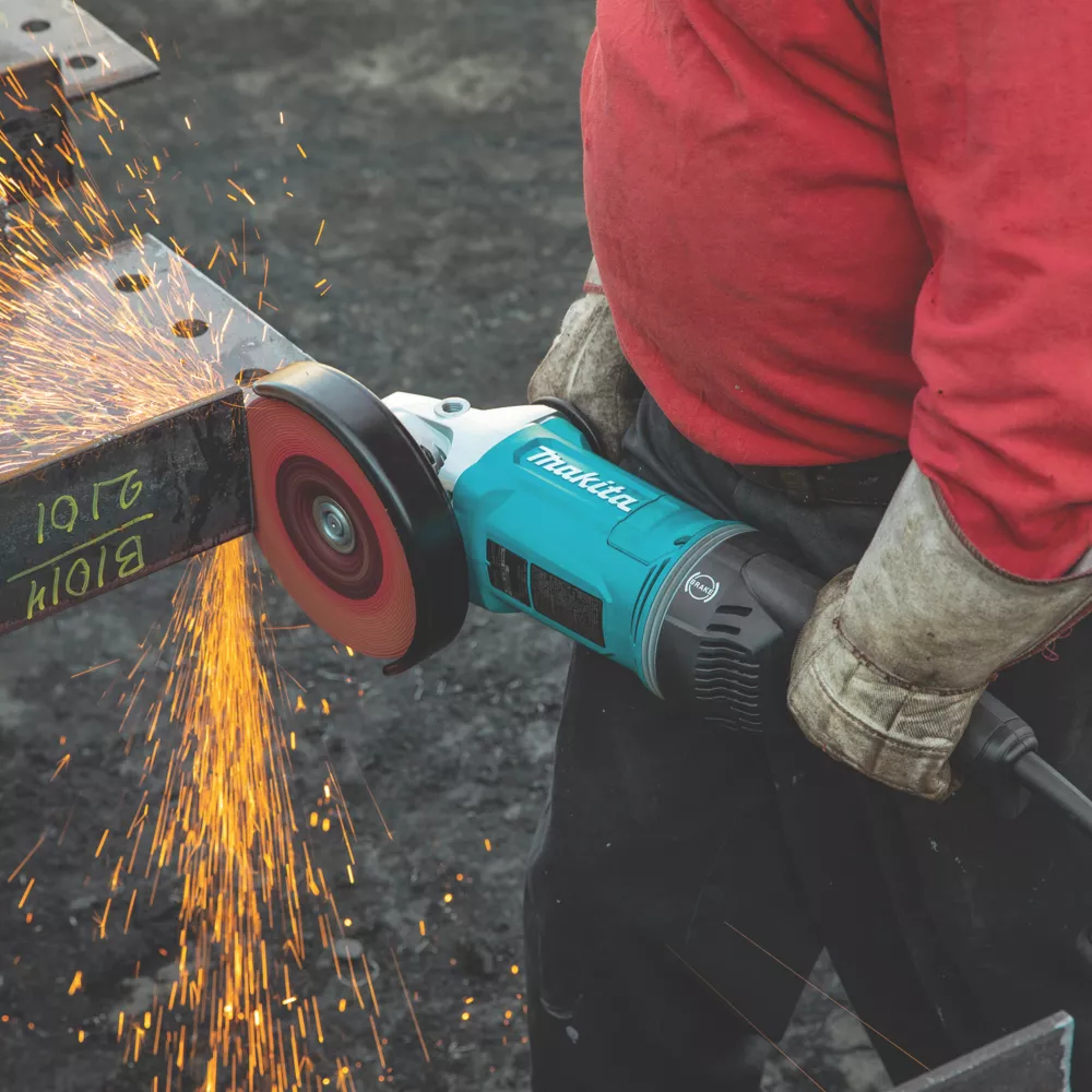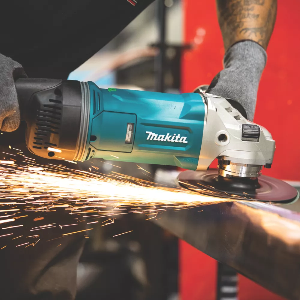 Ideal for heavy duty applications. Powerful motor and soft start for smooth start-ups and constant speed control to maintain constant speed under load. Features mechanical brake, large trigger switch with lever for lock-on and lock-off functions, anti-vibration housing and 3-position vibration-absorbing side grip. Rotatable, vibration-absorbing, straight main handle can be positioned to suit most cutting and grinding applications and gear housing can be positioned at every 90°. Also features large rubber tool rest, push-button spindle lock and anti-restart function to minimise accidental start-up. Double-insulated to protect the user from electric shock. Torque limiter and Active Feedback Sensing Technology (AFT) automatically shuts down the motor if rotation speed slows or wheel stops. Wheel cover protects from accidental scattering of broken wheel or workpiece.