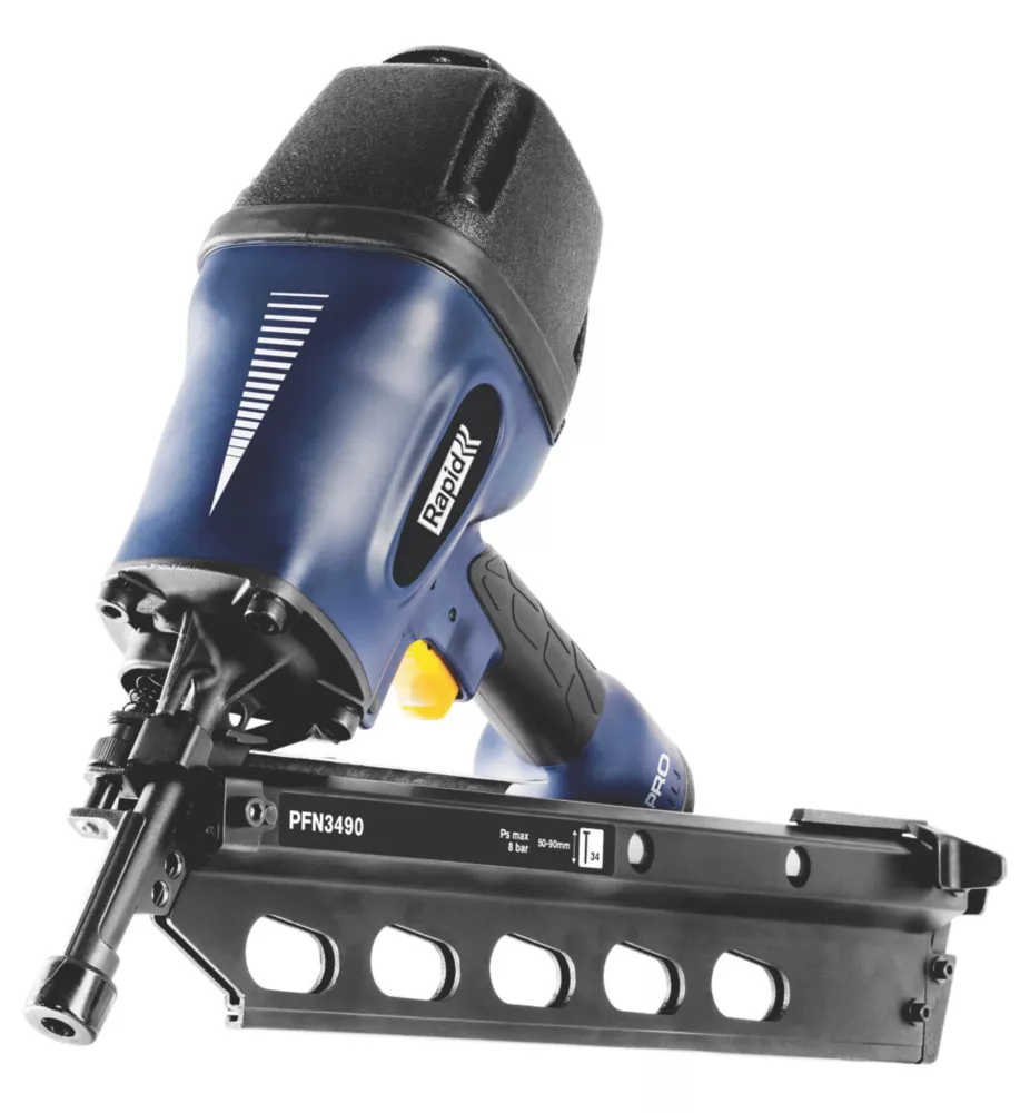 Professional standard nail gun for applications up to 90mm. Ideal for nailing studs, rafters, ridgeboards, parquet flooring, terrace and decking. Easy to work with thanks to a 34° angled magazine for optimal access, lightweight magnesium body and a 360° rotating coupling. Full sequential firing and adjustable depth penetration for safe and precise fastening. Dry-fire lockout alert before shooting the final nail. Ideal for tough jobs and demanding environments where performance and reliability are vital. Compressor sold separately.