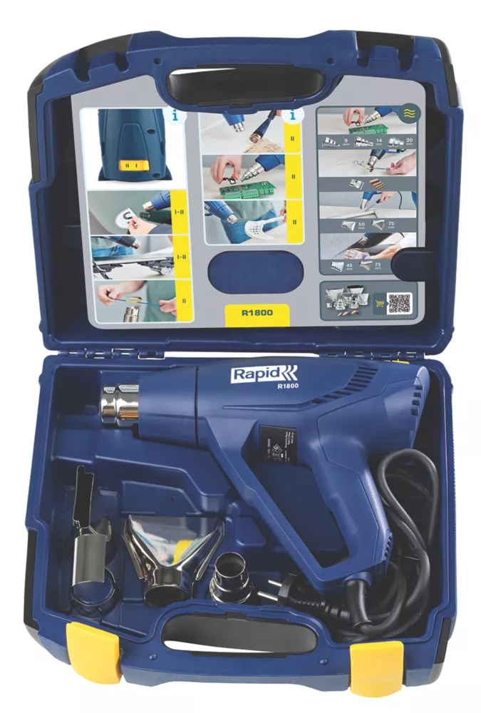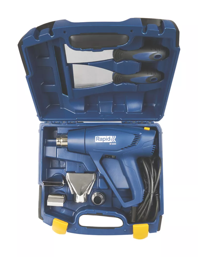 No-nonsense heat gun suitable for jobs around the home and light DIY, such as defrosting or weeding. Features 2 heat settings (300 or 550°C), 2 airflow settings and handle protection for increased safety. Rubber base for stability. Supplied with carry case.