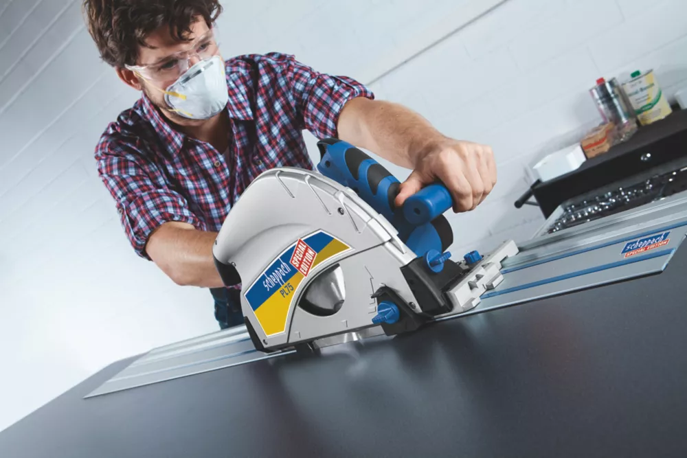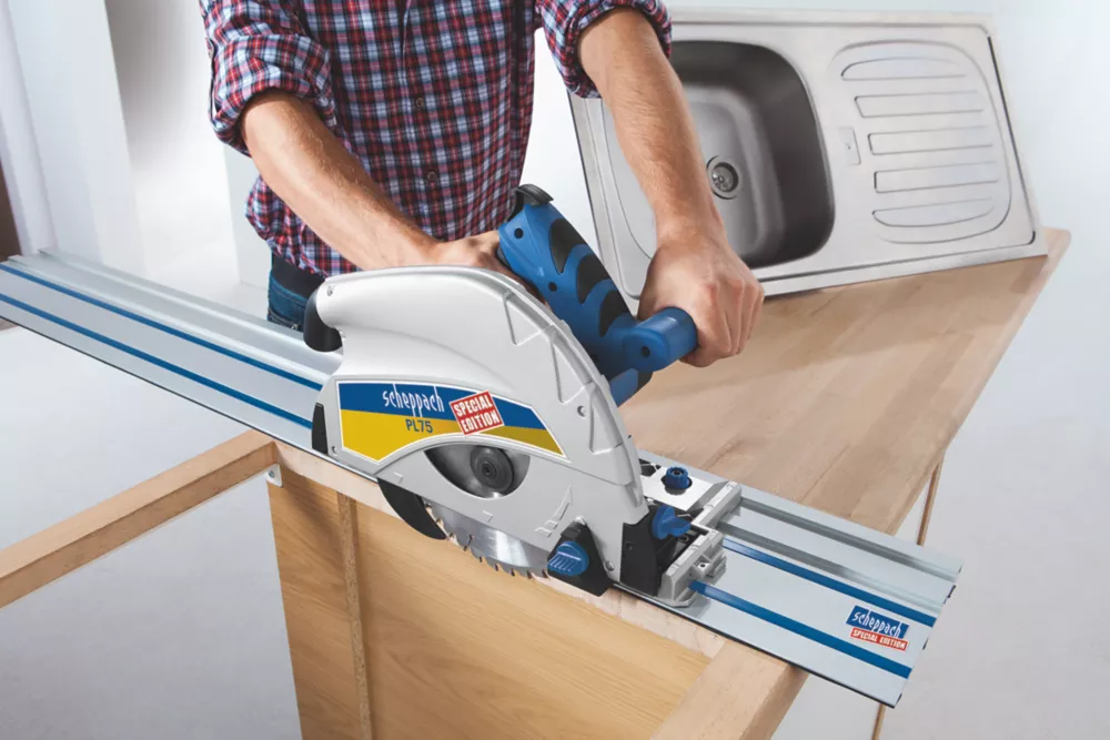 The Scheppach Special Edition PL75 240V plunge saw with guide rail is ideal for a range of woodworking jobs, including straight, bevel and plunge cuts up to 75mm. It’s great for accurate plunge cuts in kitchen worktops, close wall flush cuts and sizing down timber sections and boards. The guide rail means that you can perform precise parallel cuts up to 1400mm. The accompanying blade spanner is handy for any quick adjustments, while the sturdy blade guard puts safety first. The Scheppach PL75 is also lightweight, making it comfortable to use even on long jobs.