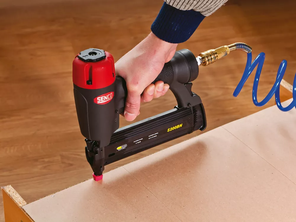 Pneumatic brad nailer drives 1.2mm (AX) brad nails from 16 to 50mm. Applications include furniture repair, cabinets, drawer assembly, case backs, chair rails, picture frames and ornamentals. Features easy clear nose piece, soft rubber grip, adjustable depth of drive and reload indicator, making jobs easier. Designed for light-duty, semi-professional and DIY applications. Includes restrictive trigger action for maximum safety, no-mar pad and on-board tool storage. Supplied with carry case.