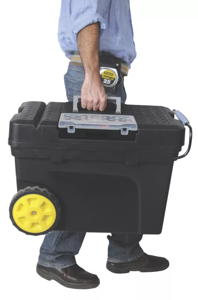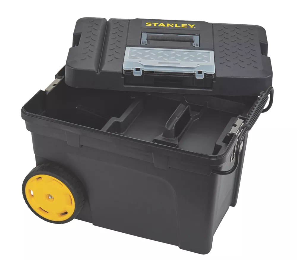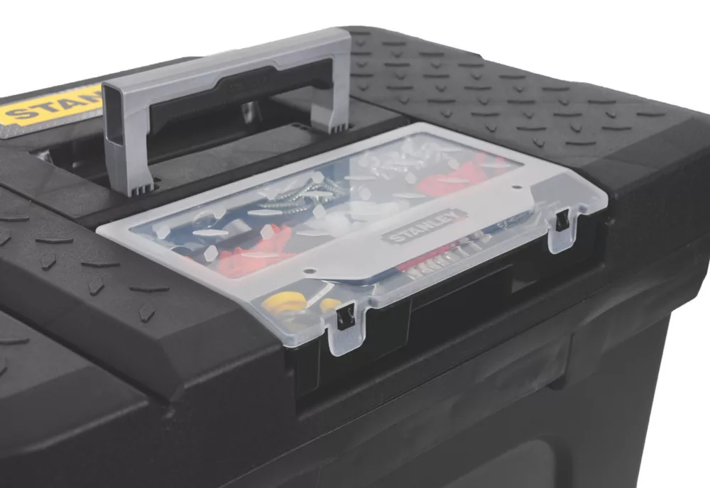 Tool chest with removable organiser for small parts and accessories. Soft-grip handle for comfort. V-groove on lid to aid the sawing of pipes and timber.