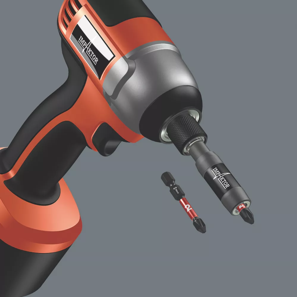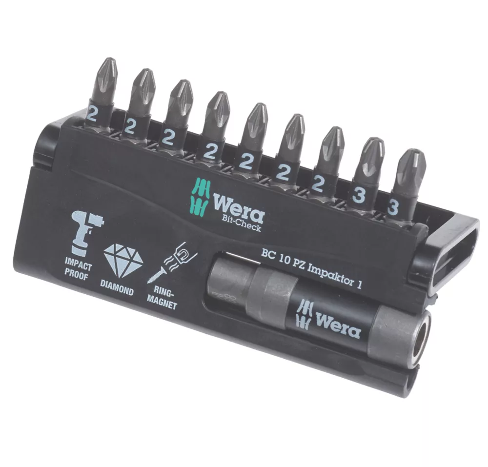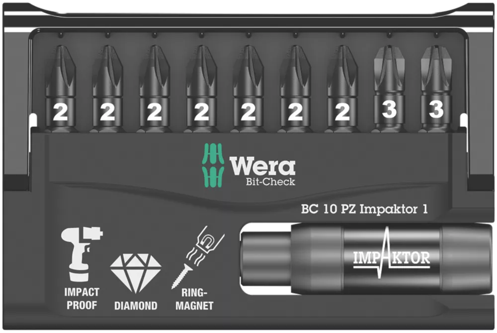 Impaktor bit set contains the premium TriTorsion Bit Holder with optional Ringmagnet function to hold screws up to 10″ long. Also contains Impaktor Diamond anti cam-out screwdriver Pozidriv bits, complemented by additional sizes from the high quality Wera bit range. Stored in a slim, compact, and easy open case for tool security and easy bit selection. Specifically designed for cordless impact drivers, these bits are suitable for heavy duty work. Diamond-coated for anti cam-out. The TriTorsion system means that together the bit and holder have 3 torsion zones to absorb the stresses applied by constant use in heavy duty impact drivers. Due to the precision hardening processes, the life of the screwdriver bits are dramatically increased.