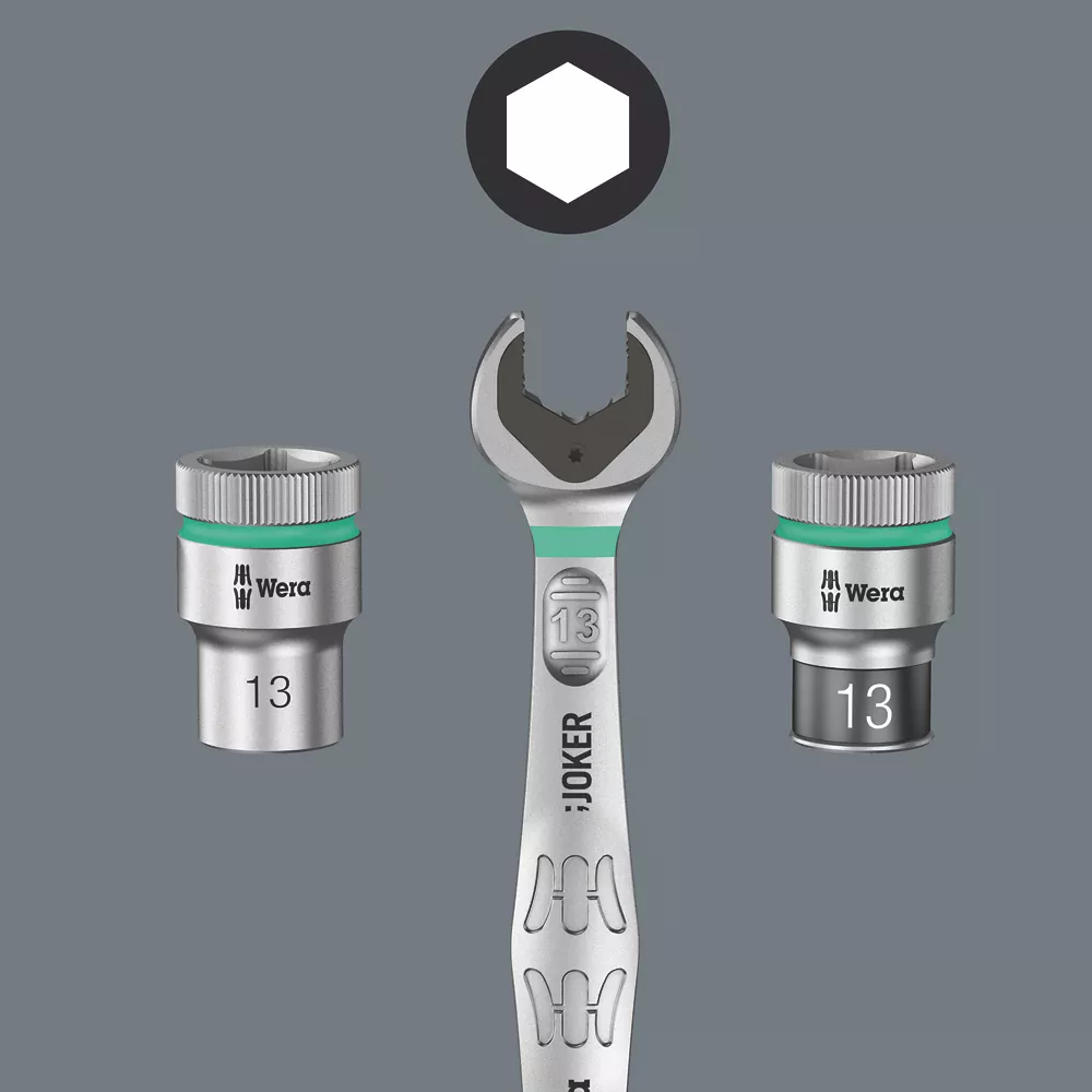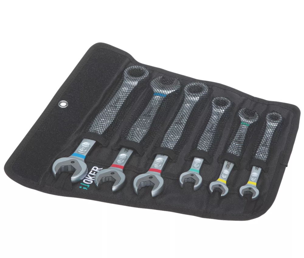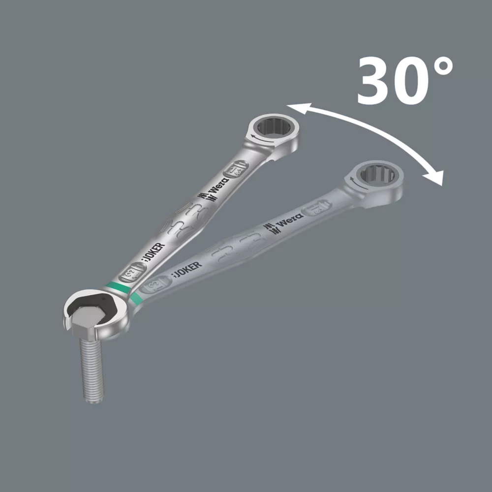 Ratchet wrench spanner for precision fastening in almost every situation. Holding function means nuts and bolts can be held in the jaw and easily positioned. Stop plate holds the nut and has teeth to grip a locked or broken nut. Reinforced jaw ensuring easier and safer releasing of the fastener. Double hex jaw allows a 30° return angle rather than the 60° a standard offset spanner needs. On the ratchet end an ultra-fine, 80-tooth mechanism has been designed allowing high torque transmission. High corrosion protection due to nickel-chrome coating which also provides a longer service life. Supplied with holding function, limit stop, 30° return angle for restricted access, anti-slip reinforced jaw, an ultra-fine high torque ratchet end and tool roll pouch.