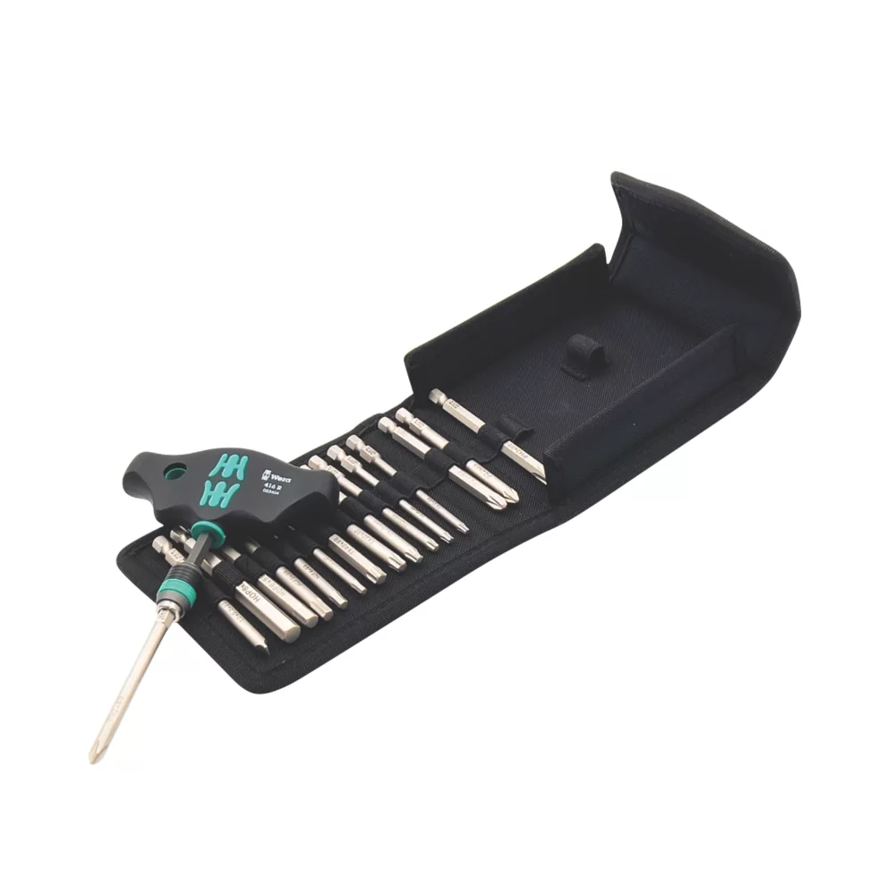 Mixed T-Handle screwdriver set with Rapidaptor technology. Ideal handle shape enables high torque transmission in difficult tightening and loosening situations. Ergonomic shape of the handle fills the palm of the hand well, while fingers lie safely in the soft-rounded handle recesses so friction losses between the hand and the handle are avoided. A holding function securely holds the hexagon socket screw on the tool. Special surface treatment of the blades for high corrosion protection and an optimum fit in the screw head.