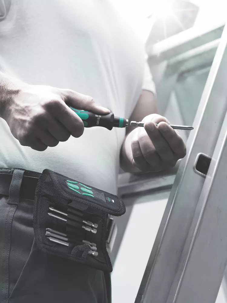 Interchangeable screwdriver set with 10 x tough viscous screwdriver blades. Kraftform bit-holding handle designed to fit perfectly into the hand to allow for fast, comfortable and ergonomic screwdriving. Handle hard zones glide like wheels across the hand for high working speeds, while soft zones provide grip to ensure high torque transfer and comfort during intensive use. Rapidaptor technology allows for rapid bit change without any extra tools and also only requires one-handed use. Rapid-in allows the bit to be inserted without moving the sleeve due to a self-lock mechanism. Rapid-out allows for the bit to be changed by simply pushing the sleeve forward, this works via a spring mechanism lifting the bit off the magnet. Rapid-spin, a free-turning sleeve, allows screw steadying at the start of the screwdriving process. Supplied in a compact pouch.