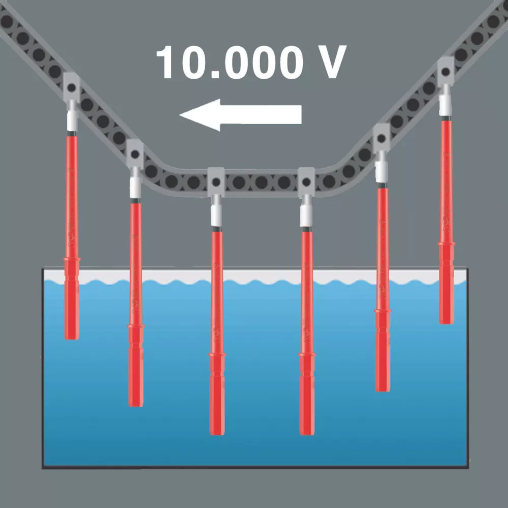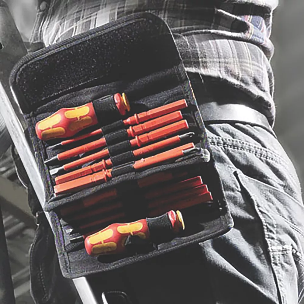 Interchangeable blade screwdriver set with 817 Kraftform VDE blade holding screwdriver handle. Kraftform Kompakt VDE components undergo a dielectric strength test to reassure users that their screwdrivers have been exhaustively tested for their most important feature: insulation. Handle features Kraftform ergonomics with hard-gripping zones for high working speeds and soft zones ensuring comfort during intensive use and high torque transfer. For Kraftform Kompakt VDE blades the handle/interchangeable blade system allows a rapid exchange of the blade and multiple applications. Extra-slim blade design allows easy access to sunken screws and spring elements. Supplied in a robust but lightweight pouch.