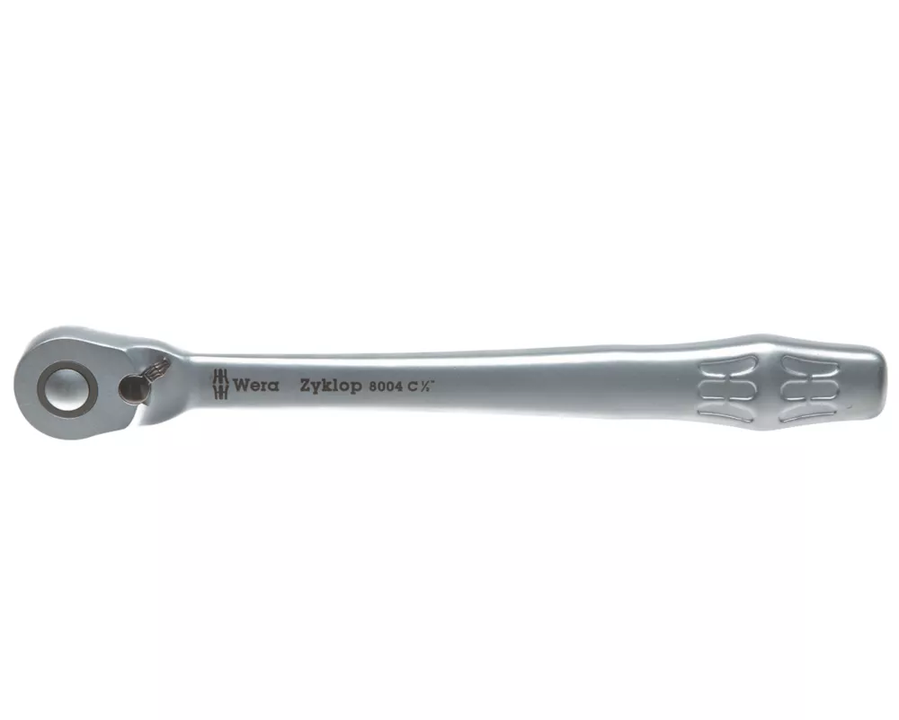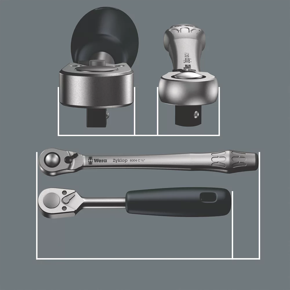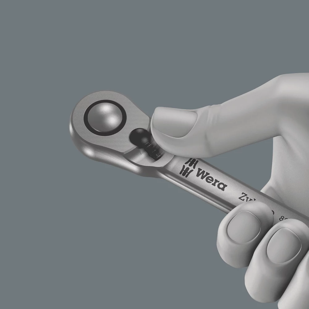 Wera Zyklop Metal Switch Ratchet designed for confined working spaces. Extra-slim design, for access where conventional ratchets cannot operate, and with a longer length handle for greater leverage. Forged, full steel ratchet construction for long service life. Ultra-fine ratchet mechanism, with 72-teeth, provides a small return angle of only 5°, perfect for those confined spaces. Simple switch lever for convenient change of ratcheting direction. Secure ball lock mechanism for sockets and attachments, with easy removal via release button.